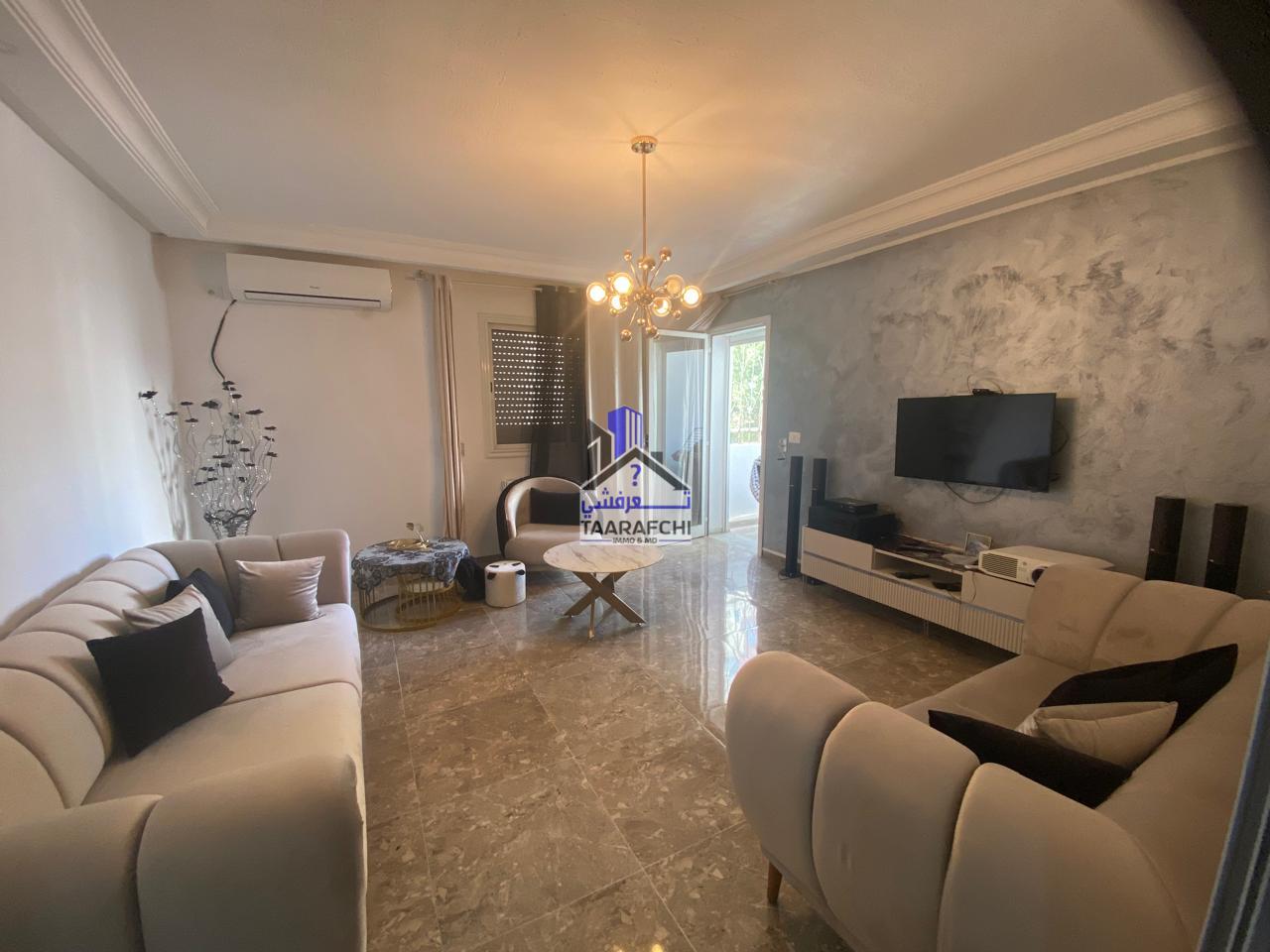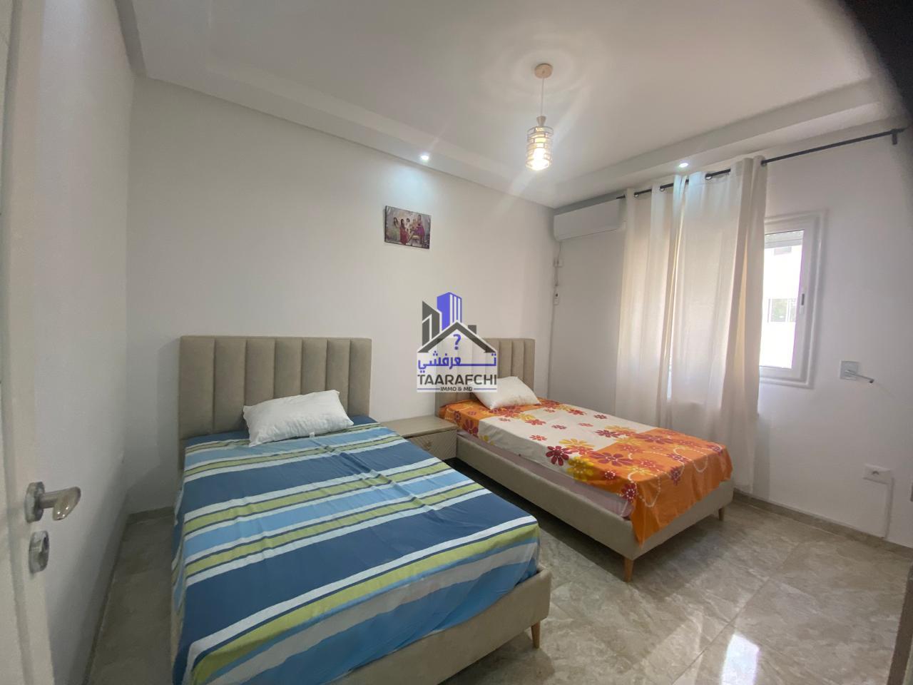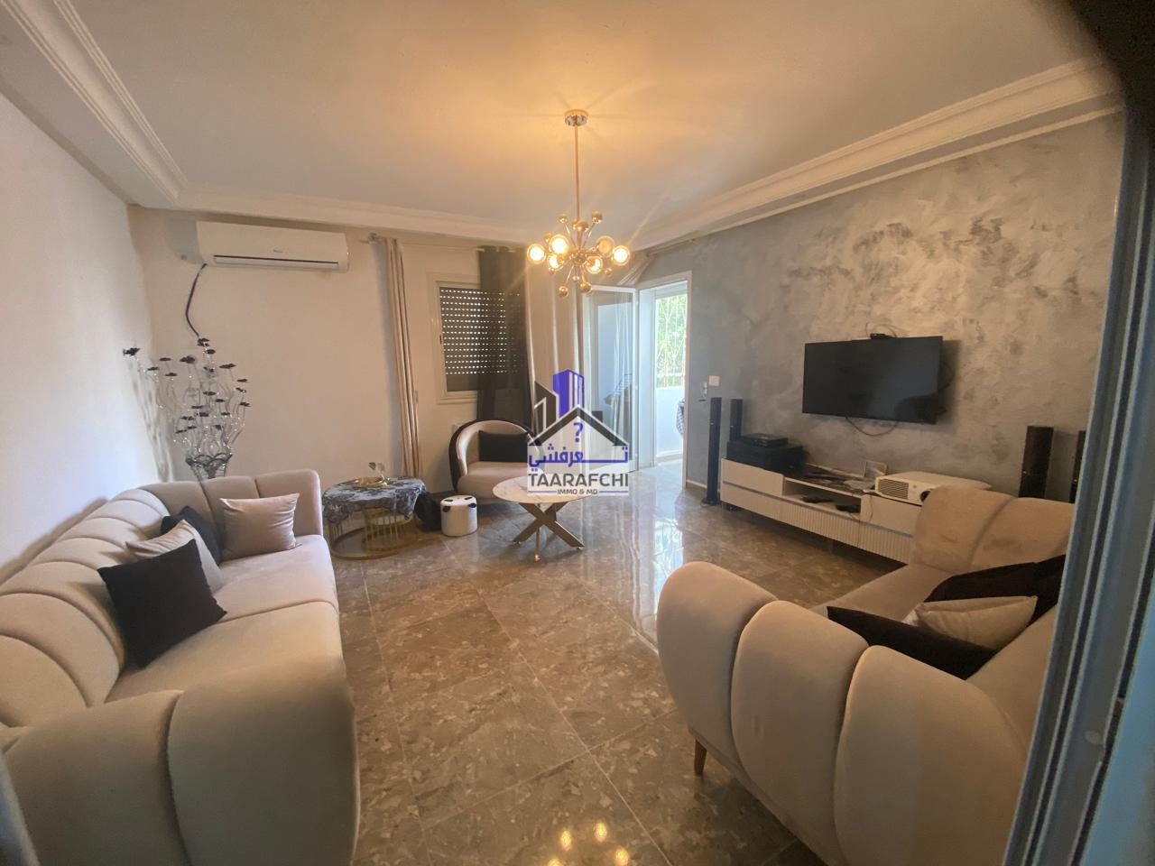 A vendre un appartement S+2 en 1er étage avec une place de parking au sous-sol situé dans une résidence gardée à Hammamet Nord.