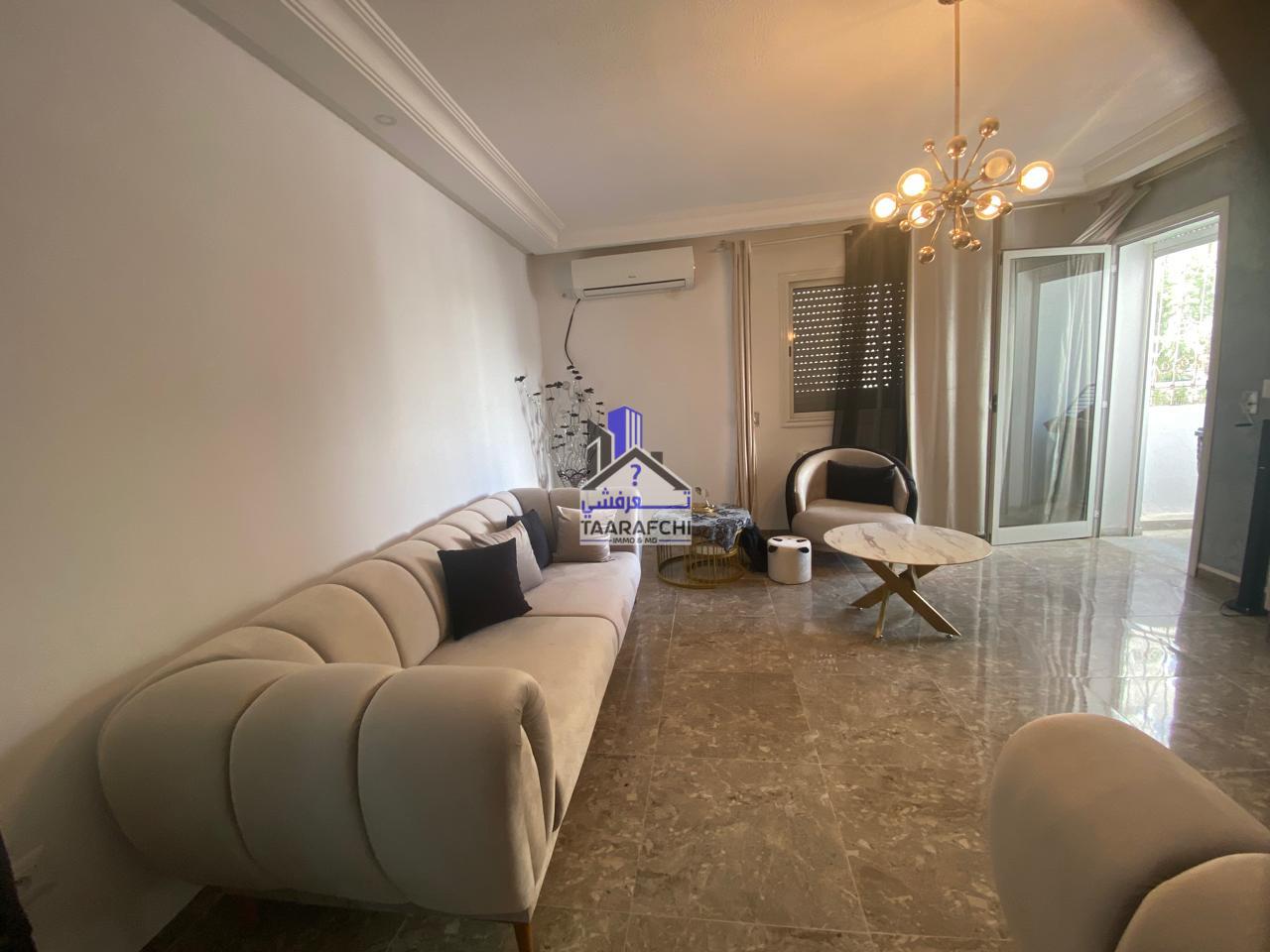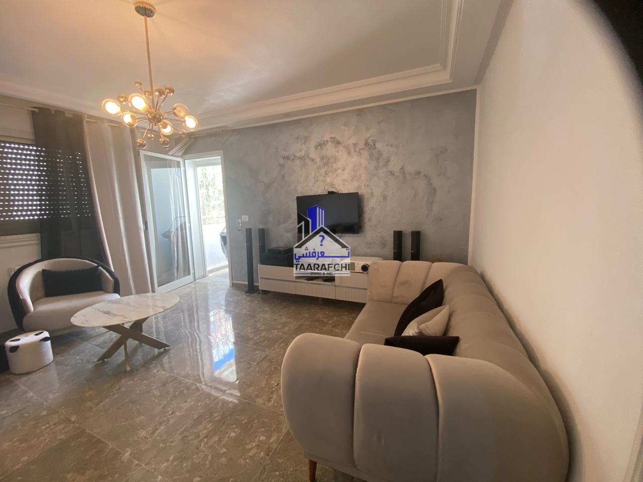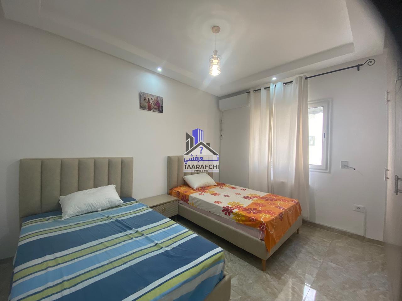 A vendre un appartement S+2 en 1er étage avec une place de parking au sous-sol situé dans une résidence gardée à Hammamet Nord.