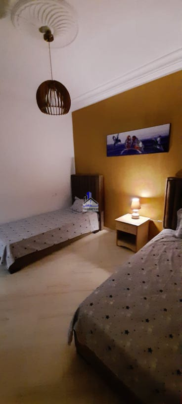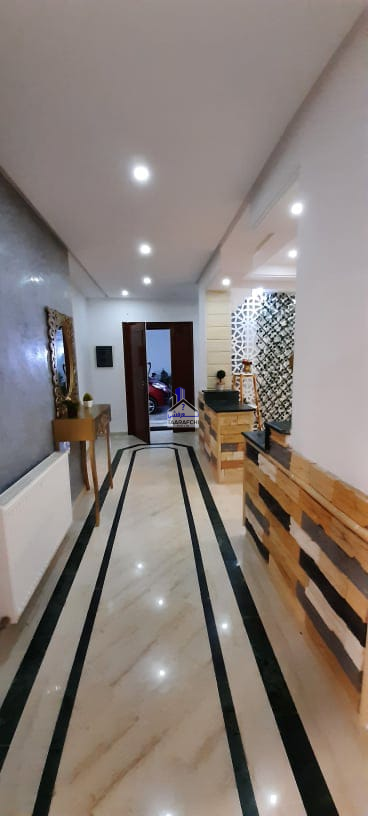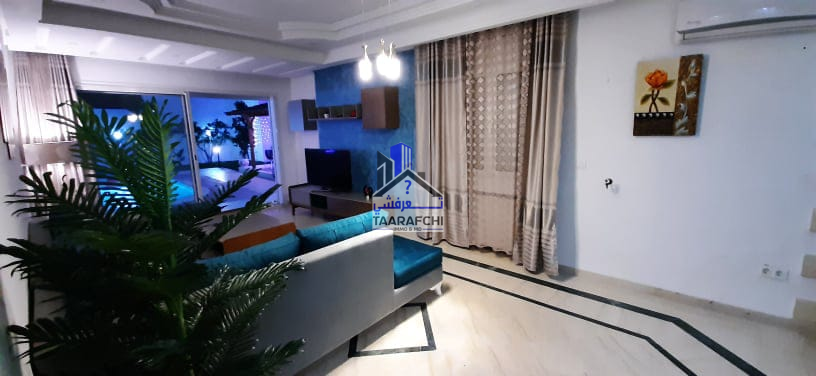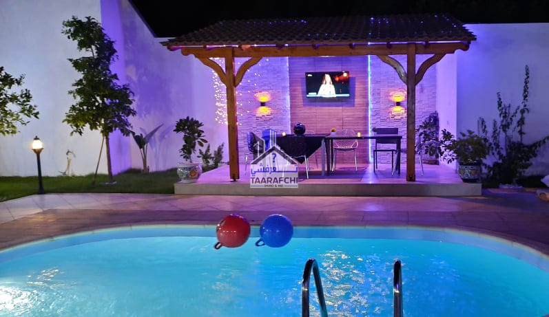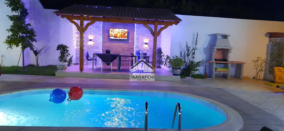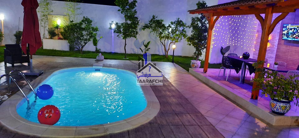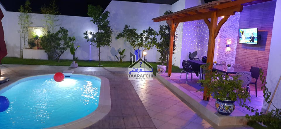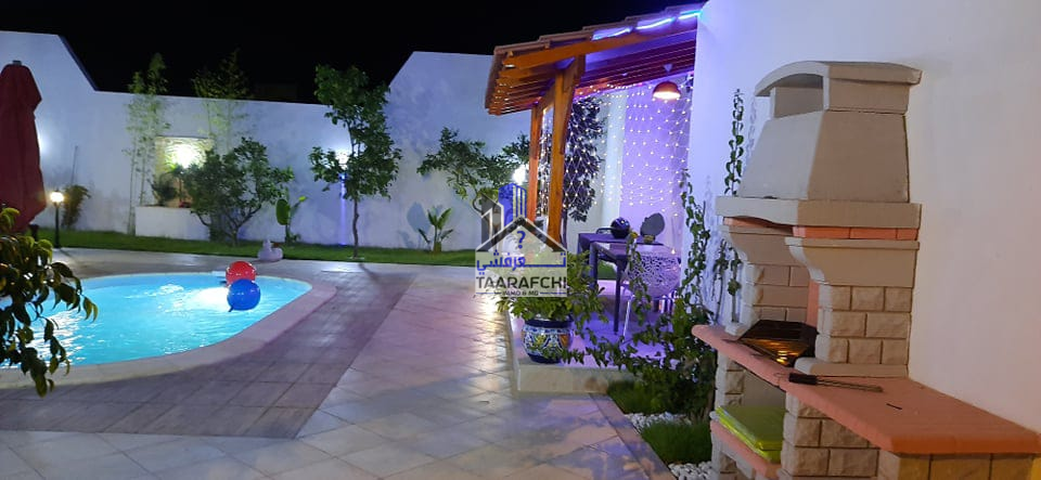 A #louer #estivalement une #villa de charme et de bon standing située à route de 05minutes de l’hôtel Sindbed Hammamet dans un endroit calme et sécurisée. La villa est répartie sur 02 niveaux : – Le rez-de-chaussée se compose d’une suite parentale (avec sa salle d’eau avec douche), une chambre à coucher, un salon, une cuisine, une salle à manger et une salle de bain. – Le premier étage se compose d’une kitchenette, un coin de salon, 02 chambres à coucher, une salle de bain et un balcon. A l’extérieur on trouve un jardin, une belle pergola, une place de parking et une piscine. La villa est bien meublée, chauffée et climatisée (03).
