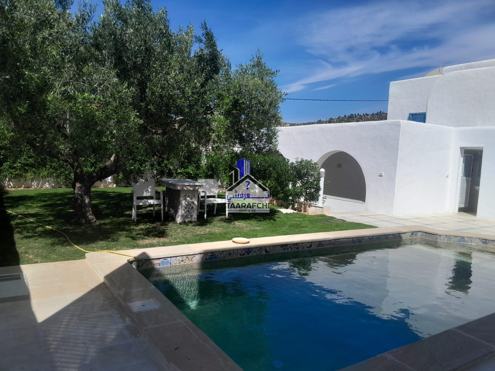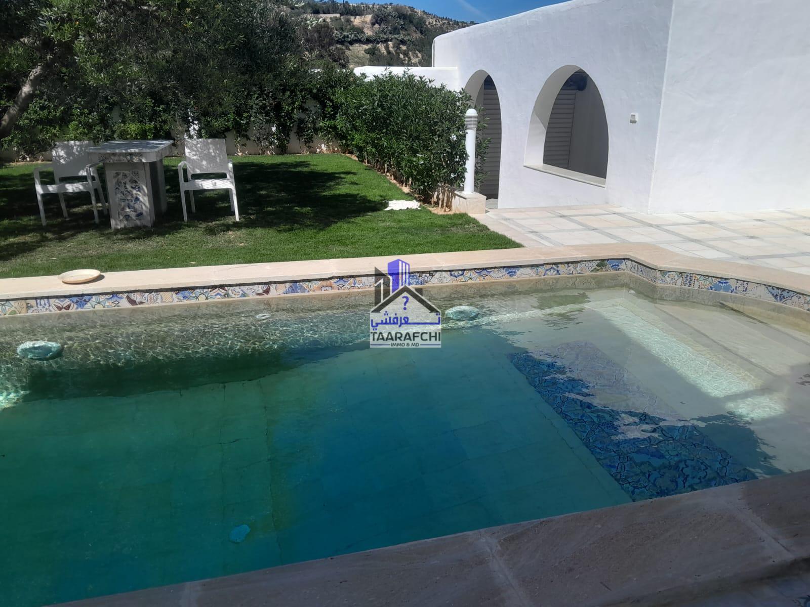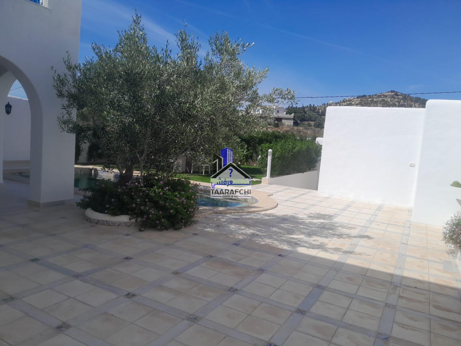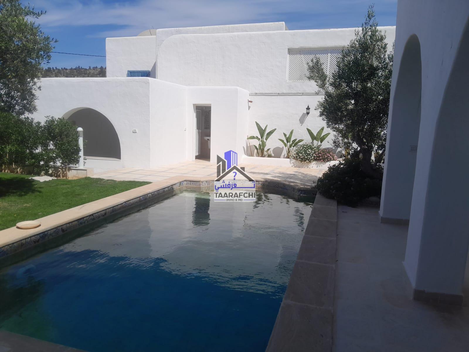 A vendre une villa S+4 de style arabesque avec piscine, abri de voiture et grand jardin située dans une cité résidentielle bien sécurisée entourée par des villas de bon voisinage à Hammamet Nord 10 minutes de la plage.