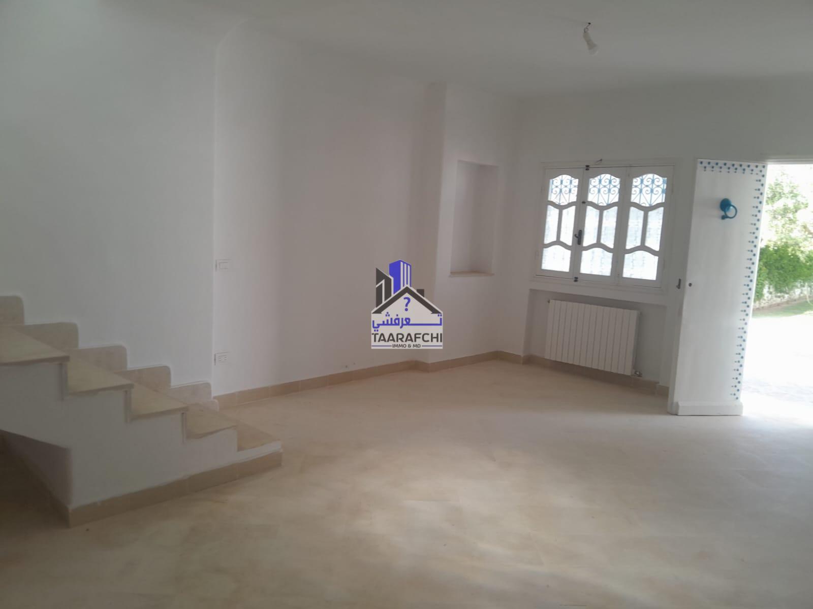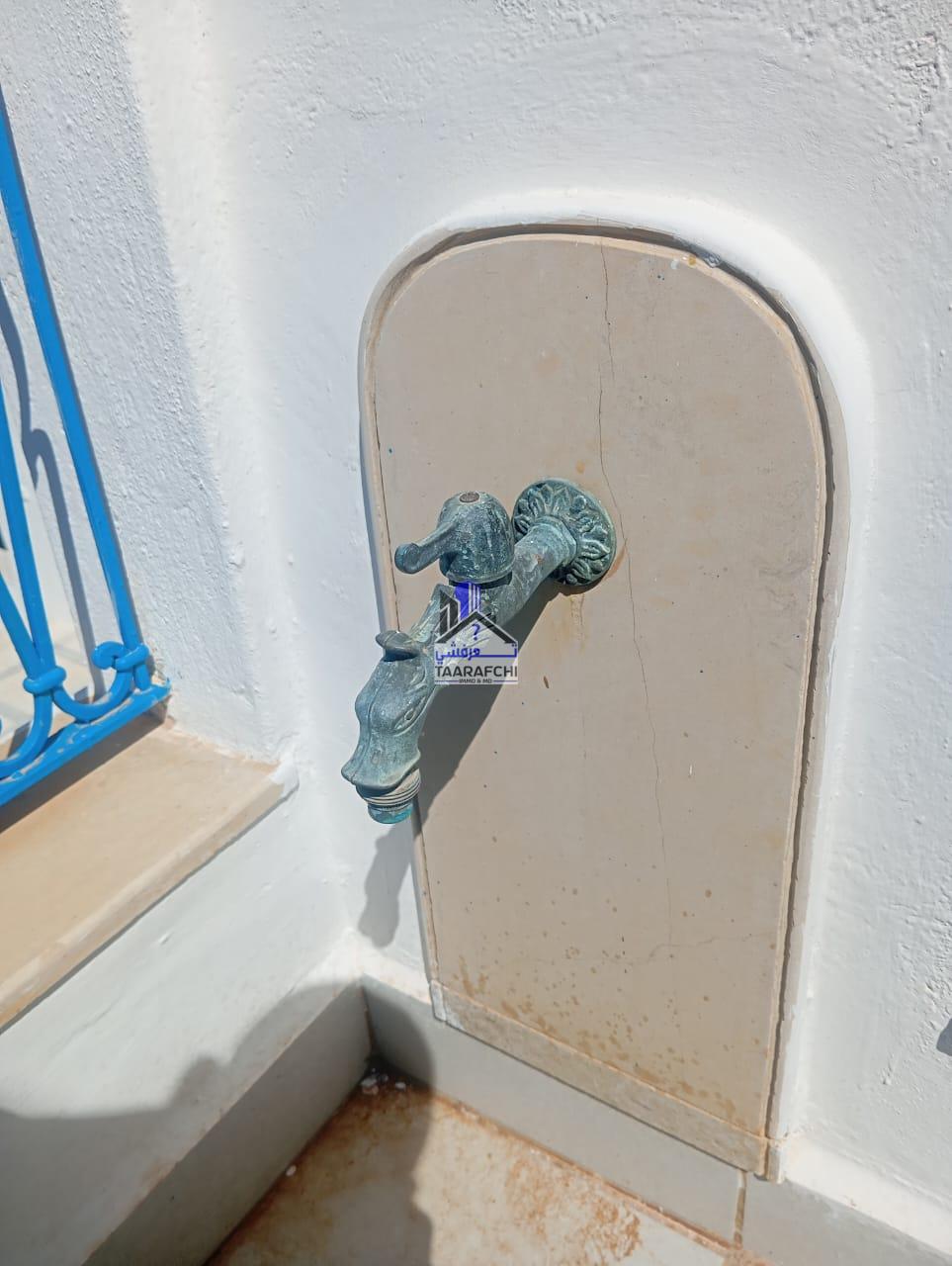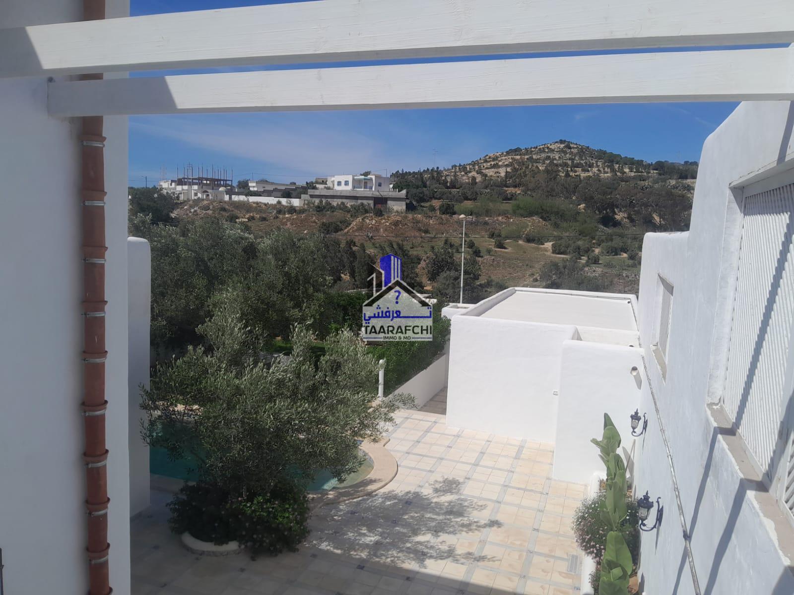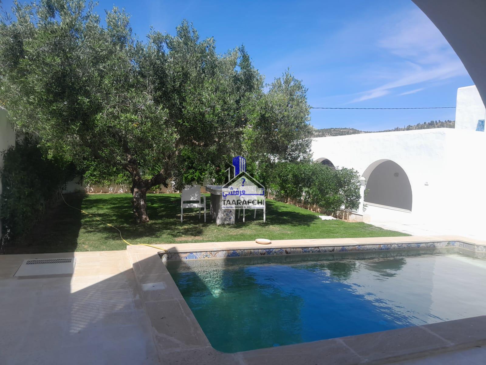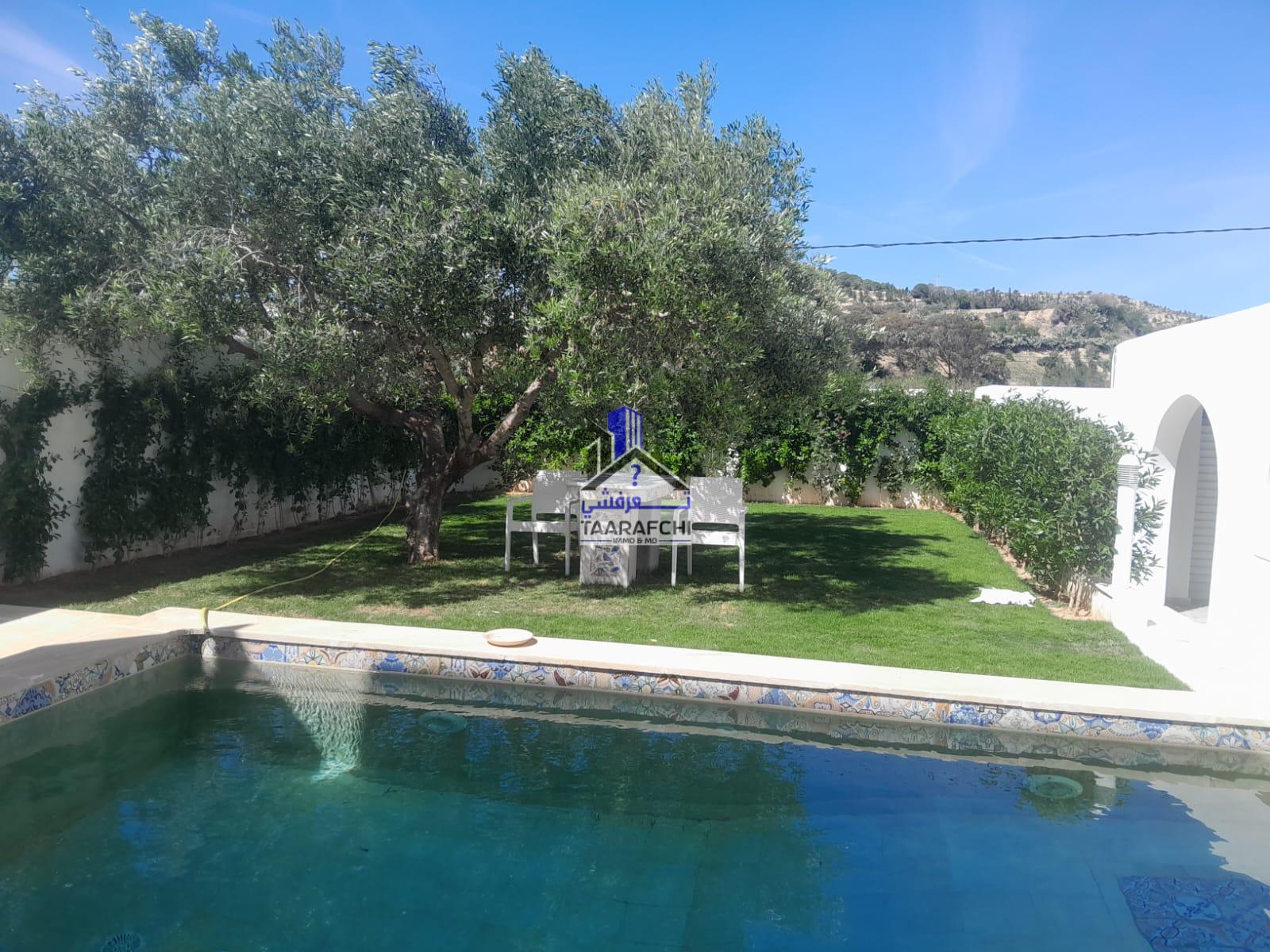 A vendre une villa S+4 de style arabesque avec piscine, abri de voiture et grand jardin située dans une cité résidentielle bien sécurisée entourée par des villas de bon voisinage à Hammamet Nord 10 minutes de la plage.