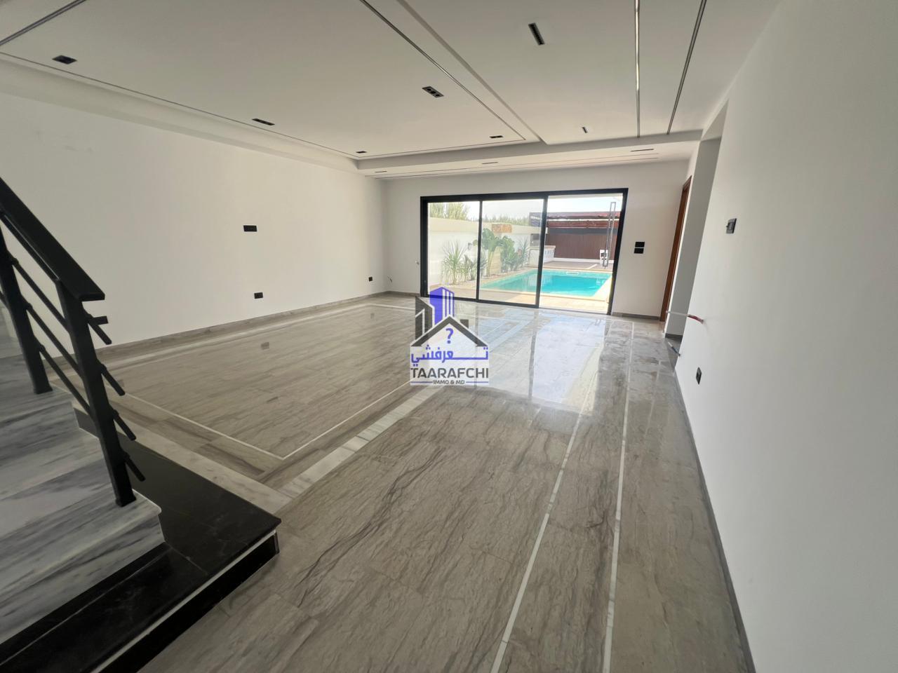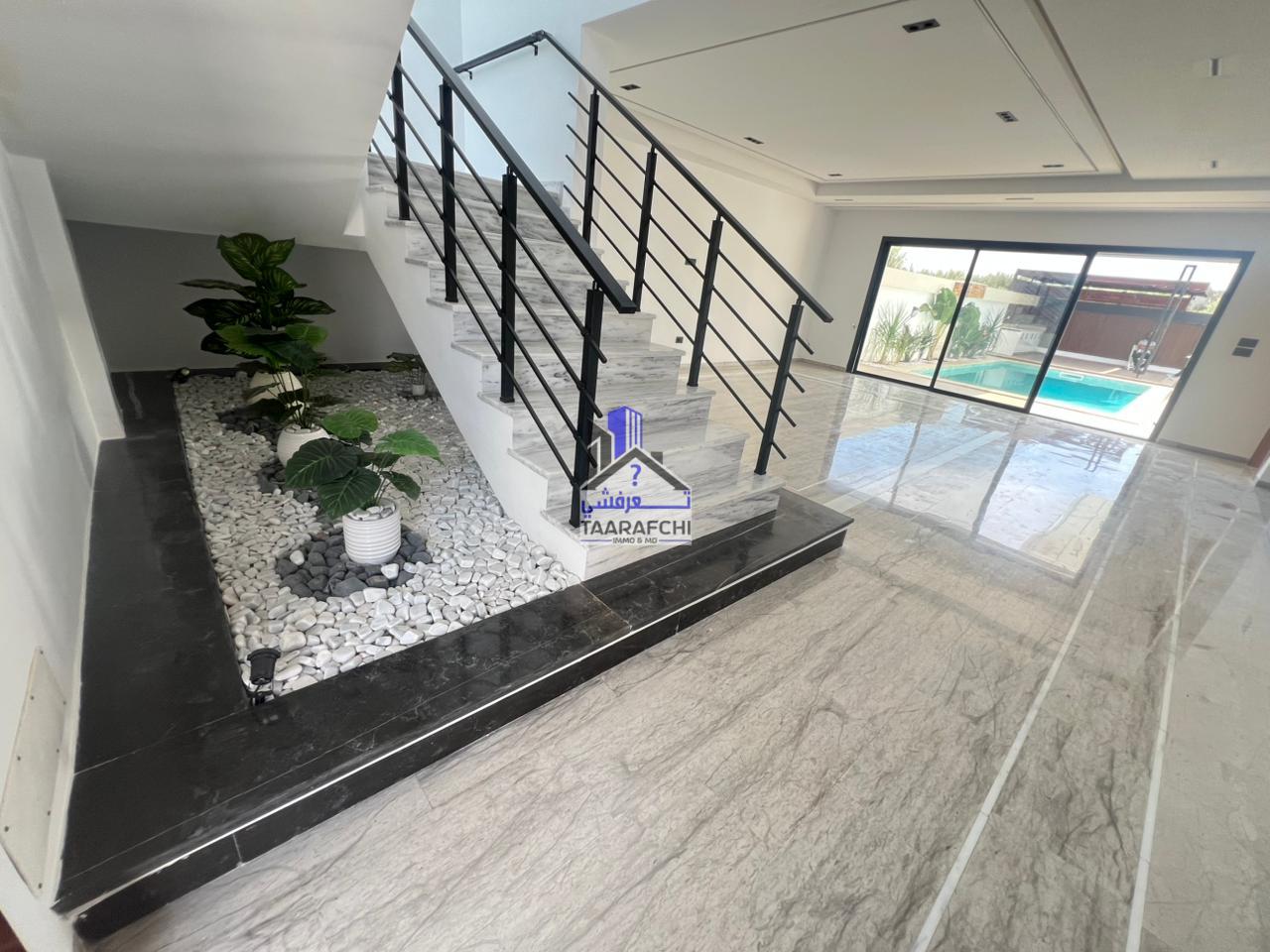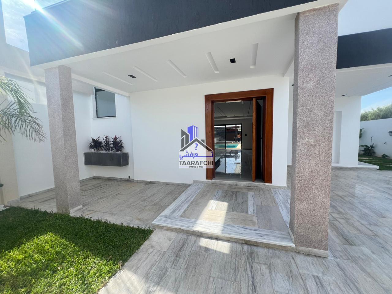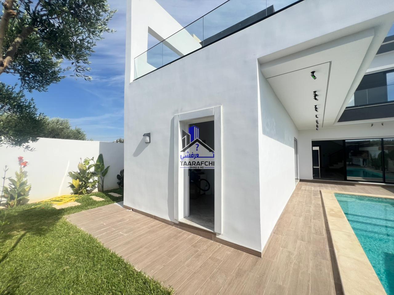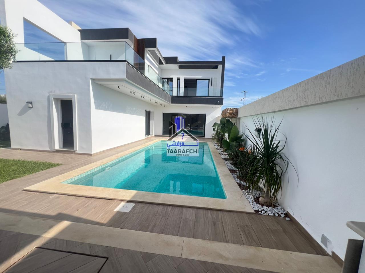 A vendre une villa S+4 de haut standing avec piscine, située dans un emplacement entouré par des résidences de bon voisinage à Hammamet Sud.